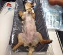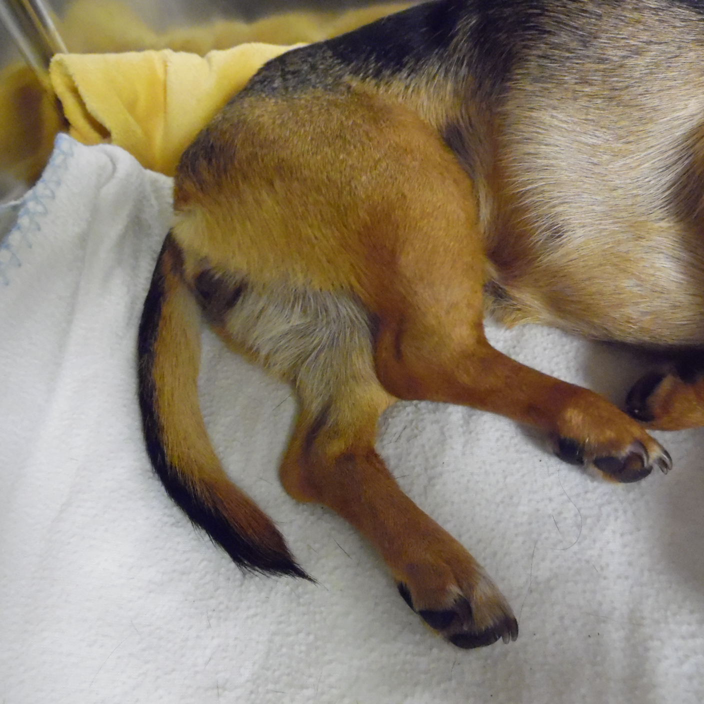 How Baby Ruth was still alive is amazing. She was found in a ditch which means she was either hit by a car or was thrown from a car. Her injuries look more like she was thrown from a car because she is so tiny that if she had been hit she would not be here today. This adorable pup has fractured legs and pelvis and a massive hernia. The hernia is right next to the Inferior Vena Cava, which returns blood to the heart from the lower part of the body. If the hernia had been any closer, Baby Ruth would have bled to death immediately. As it stood now, the pressure from the hernia alone could cause the Vena Cava to stop functioning properly. Baby Ruth had to be stabilized before emergency surgery could be done. The hernia or dark hole was filled with her liver and guts. Our Surgeon, Dr. Au said it was the largest hernia she had ever seen.