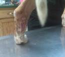 This SWEET 2 year old emaciated boxer/pit mix was picked up by the police and brought to the Forrest City, Arkansas Shelter. He was found tied to a stop sign after what appeared to have been a dog fight where he was used as bait. He is covered with bite marks and gashes all over his legs and face. His eye has been destroyed and will have to be removed. He has chunks of his lip and ear that are missing. His legs are so scarred that it looks like he has tiger stripes. He was covered with grease which is what they do to a lot of bait dogs so they will last longer during a fight because it is harder for another dog to get a grip on them. He is as sweet as can be. He has been transferred to a hospital in Jonesboro, Arkansas where he is being treated and is having surgery to have his eye removed today.
