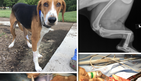 We had sweet Cooper taken to Carolina Veterinary Specialists in Matthews, NC for his procedure. Dr. Nanfelt took one look at the apparatus that had been attempted and knew it was going to be a long shot but was one worth taking. Cooper acts like nothing is wrong with him. He does not complain even under the worst circumstances. If you look at his x-rays, you will see that his leg is broken completely in two.