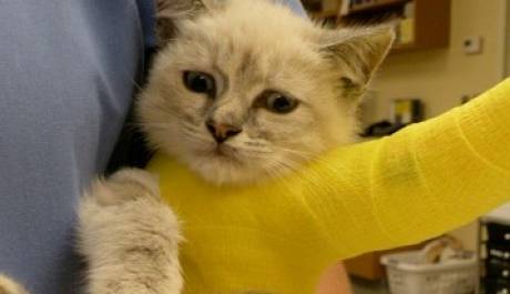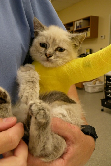 Dolce has a new home and is doing wonderful. She still has to leave her bandages on until her shoulder heals but she has completely recovered from her trauma. People just didn’t realize that this sweet kitten in the original picture is completely lifeless. She was in total shock and her body was just shutting down. It took several days on IV’s before she came out of this state.
