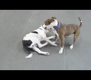 This is Gabby and Henry with their trainer playing. They both walk beautifully on a leash and are learning to be good dog citizens. They are officially ready to be placed into a loving home that is experienced with pits and their personality.