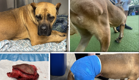 Unfortunately, we could not stop the excessive bleeding that had started from her massive weight, and she had to be taken back to the hospital. The fluid buildup from the procedure was immense, and sadly, bacteria began to grow, which needed to be treated. Fluid was drained, and the hip and leg were bandaged again to prevent fluid buildup. We are now at a place where we are seeing improvement in this beautiful three-year-old Mastiff that we love and adore.