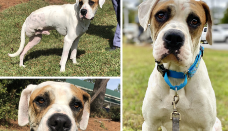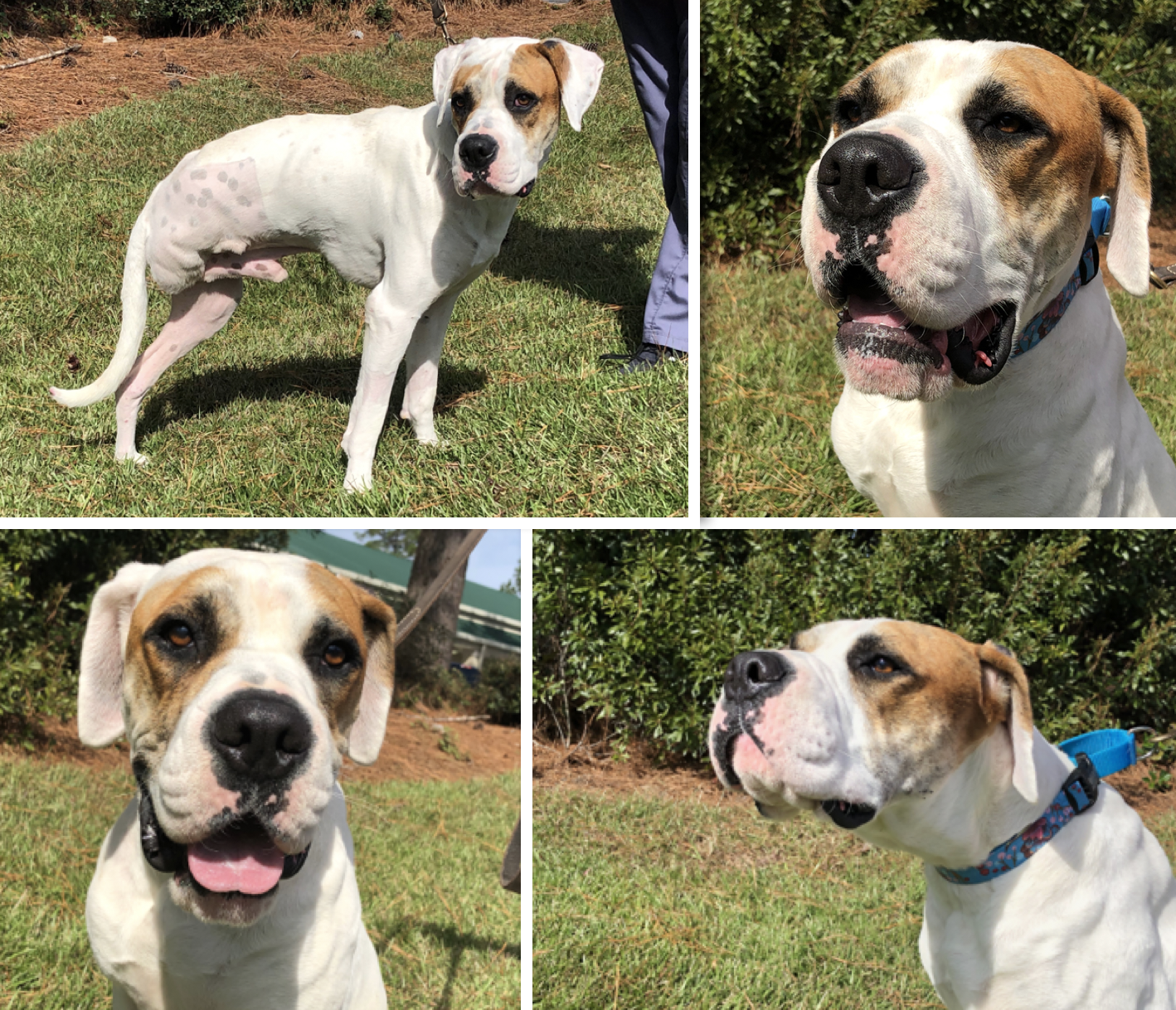 Sweet McDuff was slow on improving at the beginning. He lost one rear leg, and his remaining leg had a massive plate put on to fix the break he had. For weeks he would give you the saddest look as if begging us not to make him get up and use his leg. Weeks of coaxing and loving on this precious boy have gotten us to a place where he can officially be adopted. He will be on restricted exercise for another two weeks but has gotten to a place where he can go out for walks without buckling his rear leg.