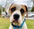 McDuff will eventually be able to run around but not until his rear leg has completely healed and scarred over. In the meantime, we are looking for the perfect Family that wants a big dog that loves everyone. He has the personality of an American Bulldog that wants to play and love on everyone with the Boxer bouncy sweetness. I see why he was once called Droopy because he can give you the saddest, droopiest expressions you could ever imagine.