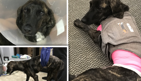 Mercy looks like a tiny plott hound/dachshund mix. Her breaks are so severe that she will require three major surgeries to attempt to put her back together. She has a distal right femoral fracture, a right acetabular fracture, left SI luxation and a bone fragment has broken off of her sacrum. She started out having her first surgeries at Charleston Veterinary Referral Center and then was transferred to the Neurology Dept. at Carolina Veterinary Specialists to have surgery with Dr. Bob Bergman.