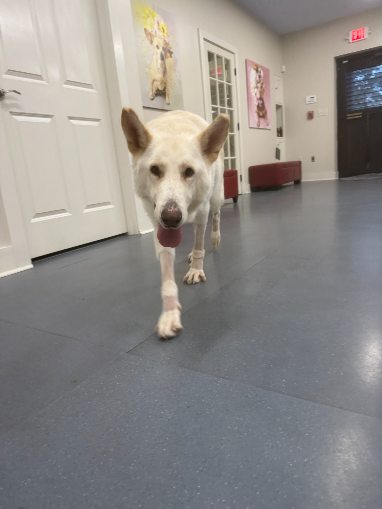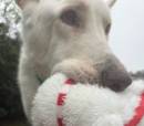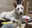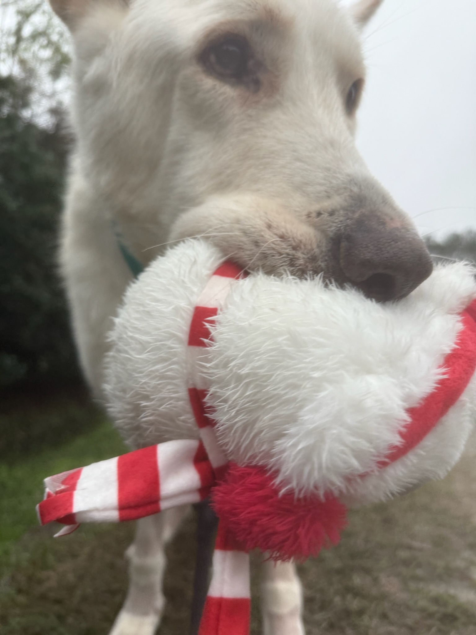 Timber’s personality is his usual cheerful self. He does seem a bit cautious with new people right now, which is understandable after such a long hospital stay. At the moment, he is completely obsessed with gathering as many stuffed toys as he can fit into his kennel. He piles them up, buries his face in them, and falls asleep surrounded by his treasures. He almost always has one proudly carried in his mouth.