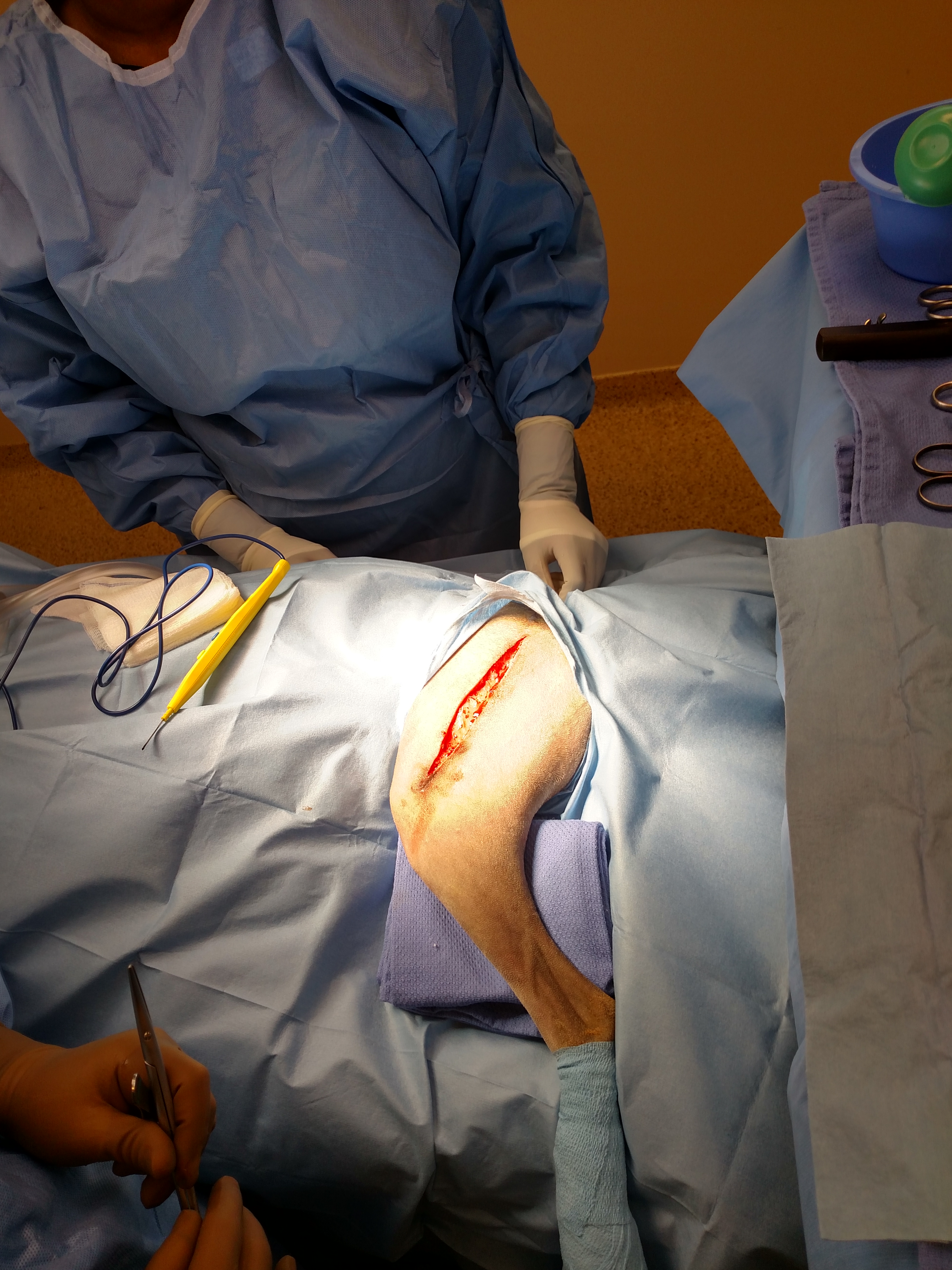 Radiographs were done on all fractures. All repaired fractures appear to have bony healing, and the implants are static and stable in the radius, the left femur, and the FHO site. The proximal portion of the left ilial plate had pulled out from the bone. Given the multiple fractures all the way up the weight bearing axis of the left pelvic limb AND given the softness of the bone at the proximal ilial wing, we are not shocked this had occurred. I am sure there were a lot of varying forces transmitted across this site while she has been healing. The ilial bone fracture site appears healed underneath which is great. The little skin defect noted on the left side of the hip area corresponds to the loose screws at the proximal ilial plate and the draining tract.